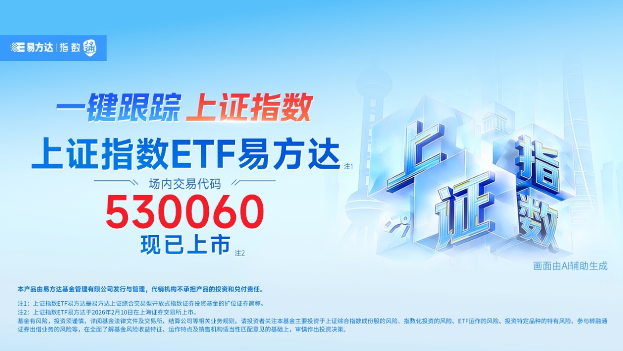 易方达上证综合交易型开放式指数证券投资基金(场内交易代码:530060,场内简称:上证综 E,扩位证券简称:上证指数ETF易方达)于2026年1月30日成立,募集份额合计321,193,000.00份,于2026年2月10日上市...